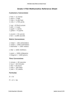Web grade 8 fsa mathematics reference sheet customary conversions 1 foot = 12 inches 1 yard = 3 feet 1 mile = 5,280 feet 1 mile = 1,760 yards 1 cup = 8 fluid ounces 1 pint = 2. This math test prep reference sheet is a quick guide for upper elementary students to reference. Web fifth grade math can be complicated for.