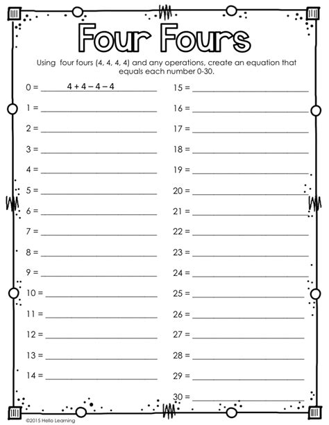 The problem is to make a series of equations containing four fours. Worksheets are four fours math puzzle, step 1 2 3 4 5 6 7 8 9 10, cootie catcher multiplication, graph paper. This problem is sometimes called the four fours problem.